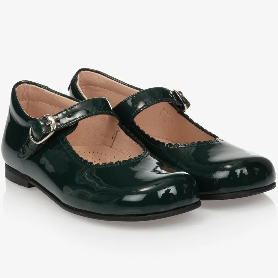 Exclusive to Childrensalon, a pair of smart, dark green patent leather shoes for girls from Children's Classics, with a buckle fastening strap. These classic Mary Jane style are comfortable to wear, with soft leather lining and insole. They have a rubber sole and a small heel.