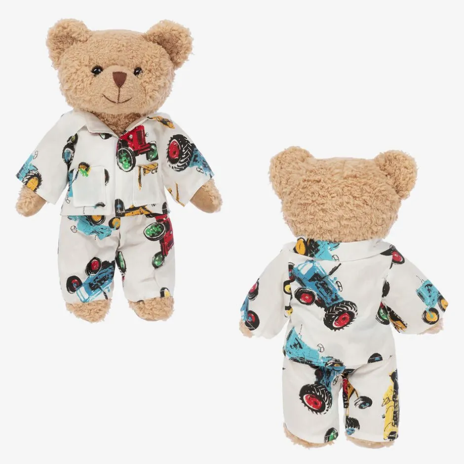 A charming gift set for boys by Childrensalon Hampers, comprising pyjamas and an adorable teddy bear by Powell Craft. Made in white cotton poplin with a colourful tractor print and green piping trim, the comfortable pyjamas are traditionally styled. The top fastens with covered buttons and the trousers have a gently elasticated waistband, ideal for a comfortable night's sleep. A characterful beige teddy bear, wearing matching pyjamas, completes this delightful set.