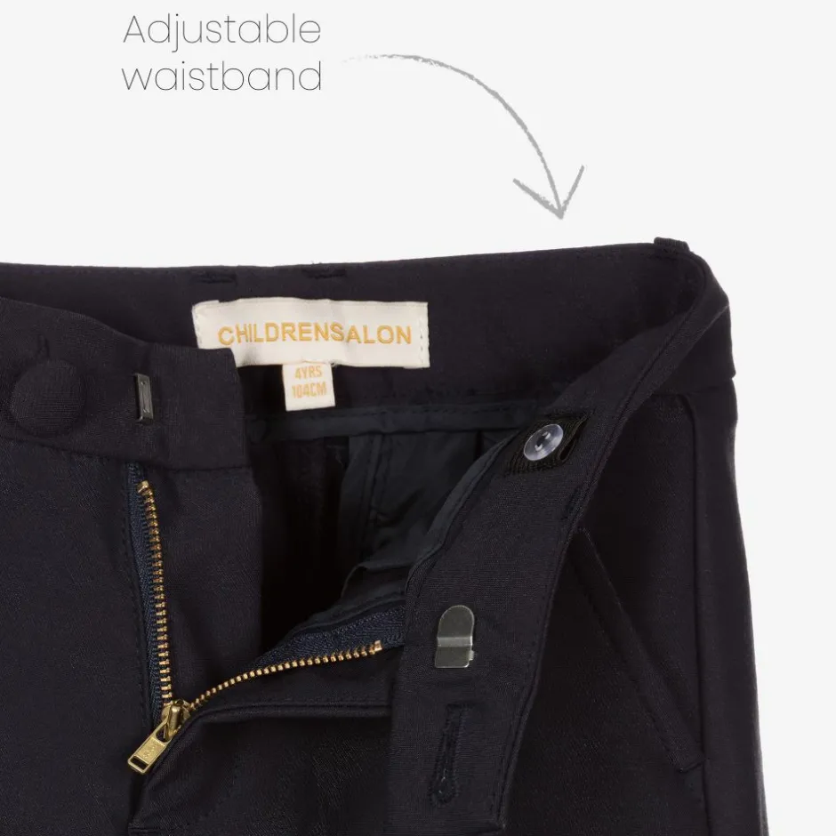 Smart navy blue trousers for boys by Childrensalon Occasions, exclusive to Childrensalon and ideal for special events. Lightweight and with a subtle sheen, they have slanted front pockets and fabric-covered button fastenings on the back pockets. The waistband is adjustable on smaller sizes for a comfortable fit and has useful belt loops. The trousers fasten with a button and zip on the front.