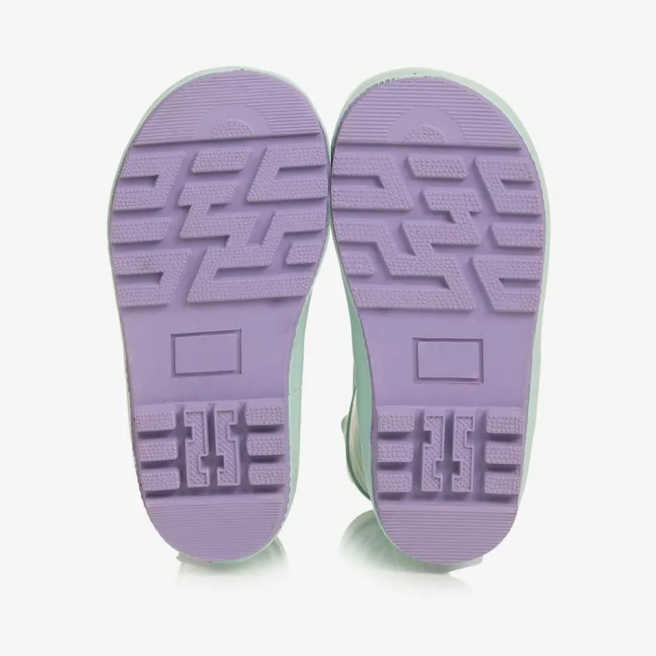 Aqua green and blue rain boots for girls by Chipmunks, made in smooth, flexible rubber. With a lilac purple fleece lining for cosiness, they have a lovely mermaid pattern and friendly character print, whose 3D tail extends on the back of the boots. There are useful handles on smaller sizes to help pull them on easily.