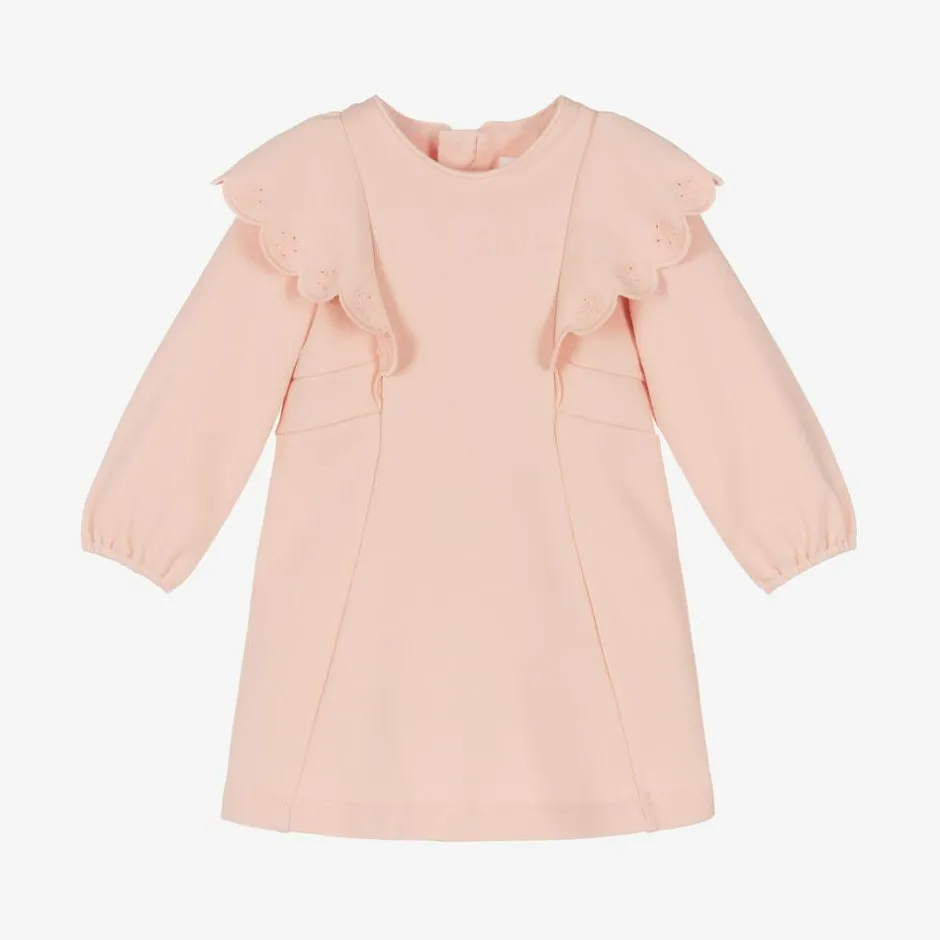Pretty pink long-sleeved dress for baby girls by luxury French designer Chloé, made in a cotton and viscose blend jersey. It has large, scalloped frills on the lined bodice, beautifully embroidered with flowers. The dress is panelled, creating a flared design, with subtle logo embroidery on one side and gently elasticated cuffs. It fastens with a concealed zip on the back.
