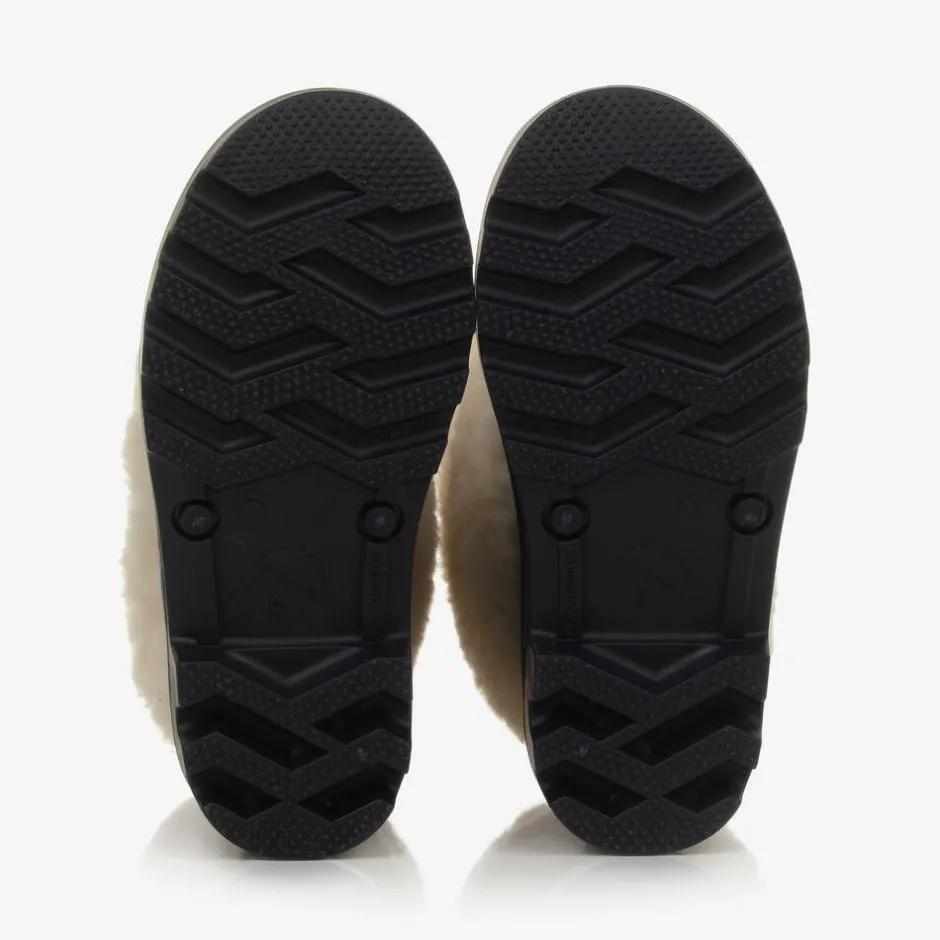 Practical yet stylish, these navy blue rain boots for girls are by luxury French brand Chloé. The rubberised uppers have gorgeous ivory faux fur trims, with a rubberised logo badge on one side. They have a soft textile lining for comfort, with treaded rubberised soles for good grip.