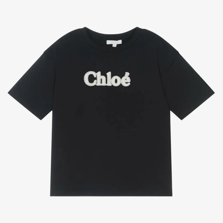 A navy blue T-shirt for girls by French label Chloé, soft and comfortable in organic cotton. Adding a touch of whimsy, the white logo on the front is embroidered in a lovely, intricate design. The dropped shoulders and boxy shape make it a great choice for laid-back days.