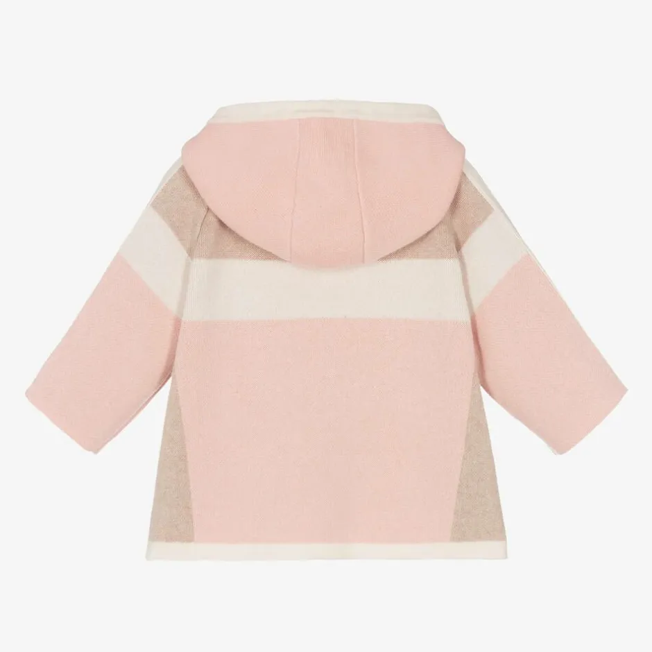 A charming colourblock cardigan for little girls by luxury brand Chloé, in lovely pale pink, ivory, and beige shades. Inspired by the signature Chloé cape, it is knitted in a soft organic cotton and wool blend and has a white embroidered logo on the chest for a subtly branded look. Designed with a delightful hood, it has concealed popper fastenings on the front and a stylish gold logo-embossed D-ring on the neckline.