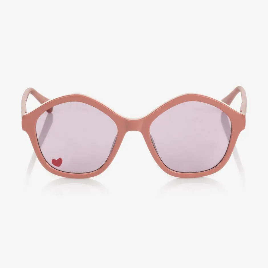 Girls dusky pink sunglasses by luxury French designer Chloé, with a geometrical-shaped frame. The purple tinted lenses have a category 2 filter, providing good protection against sun glare. They have a small red heart detail on one lens and logo branding on one arm. These stylish sunglasses come with a protective zip-fastening branded pouch and cleaning cloth.