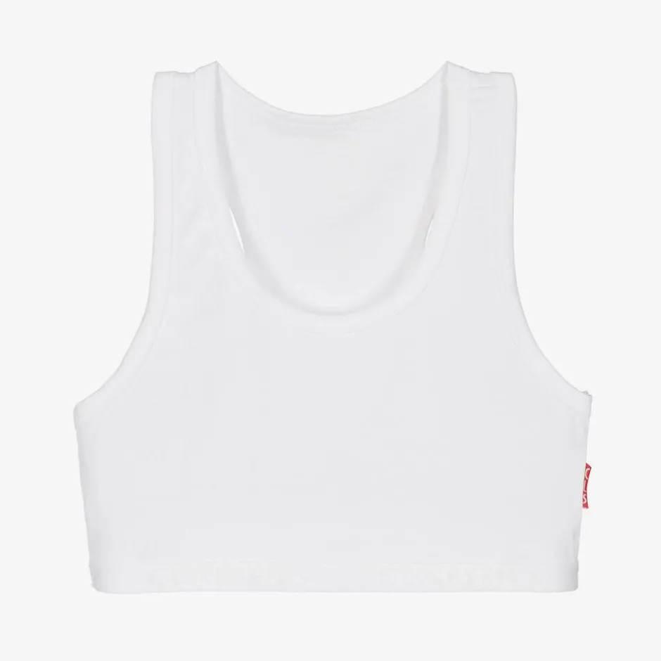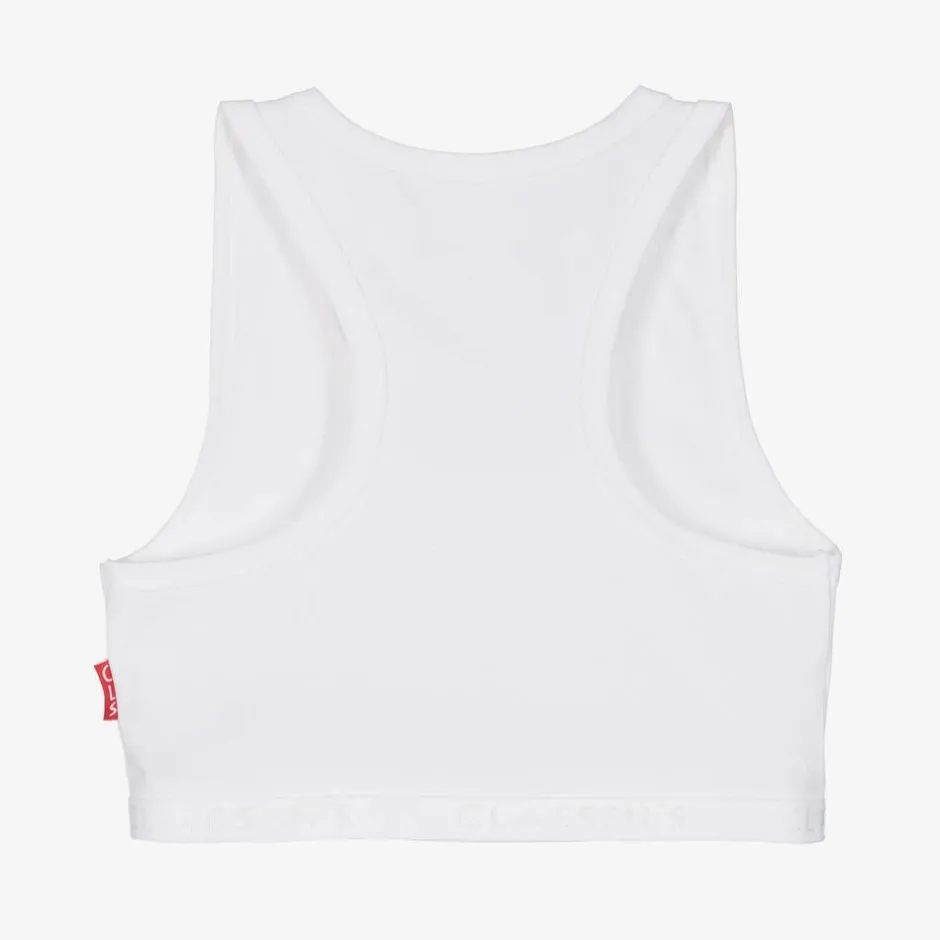 Girls white bra top by Dutch brand Claesen's, made in soft and stretchy cotton jersey. It has a sporty racerback and an elasticated logo band for extra comfort.