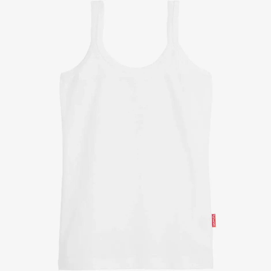 Girls white vest by Claesen's, made in soft and stretchy cotton jersey. A simple design, this comfortable top has thin shoulder straps which can be adjusted on the back for a secure fit.