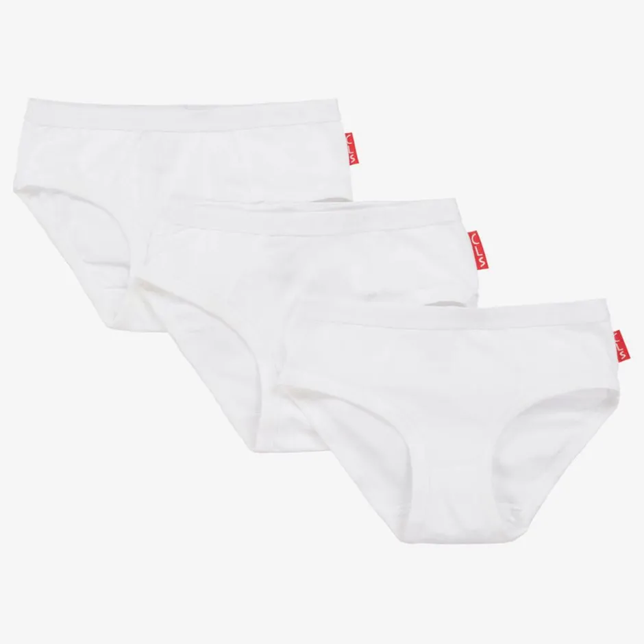 Pack of two white knickers for girls by Claesen's, made in soft and stretchy cotton jersey. These comfortable briefs have a tonal logo branded elasticated waistband.