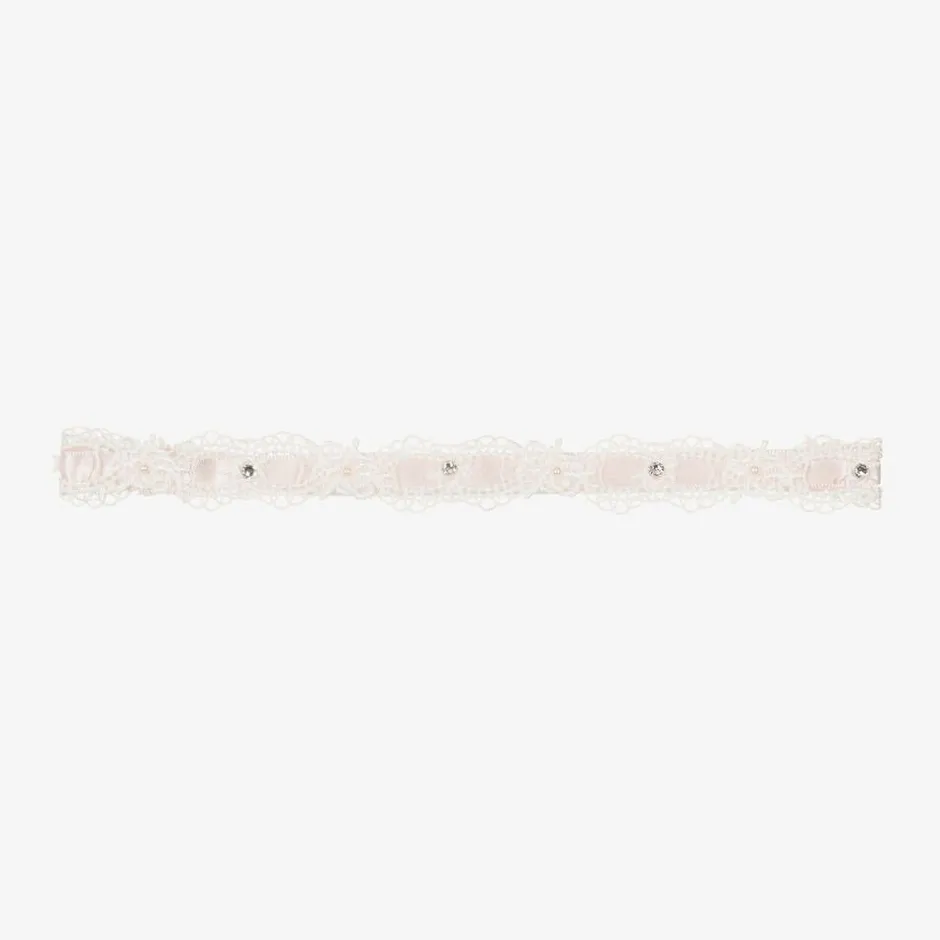 Sweet and pretty, this pale pink and white headband for baby girls is by British brand, Cute Cute. Handmade from silky ribbon with lovely lace detailing, it has tiny faux pearl and diamante embellishments for added sparkle. There is a velour elasticated panel on the back to ensure a comfortable and secure fit.