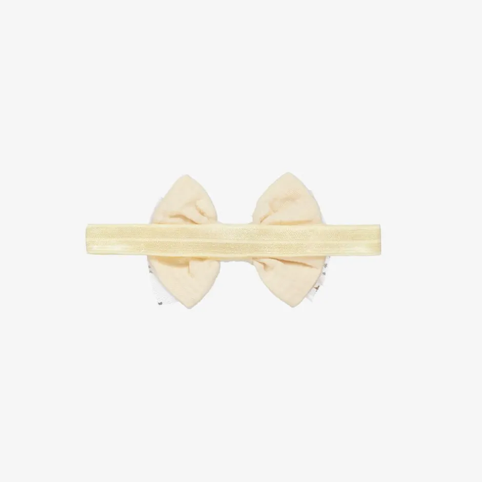 A beautiful headband by Cute Cute with an ivory tulle bow, printed gold stars and a matching charm. Made to fit girls of all ages, it has a stretchy elasticated band in ivory.