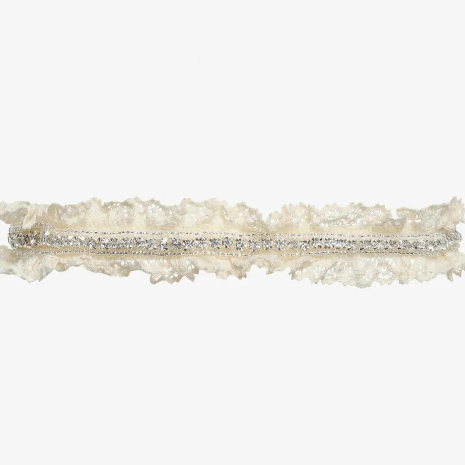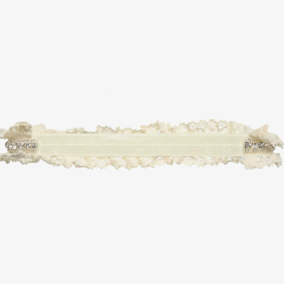 Girls ivory headband by Cute Cute, made from a pretty vintage style ivory lace. It has sparkling diamanté and a shimmery ivory stretchy elasticated band on the back.