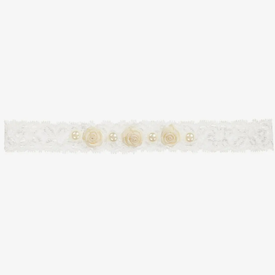 A sweet ivory headband for baby girls by Cute Cute, with satin roses and pearls on a stretchy elasticated lace band.