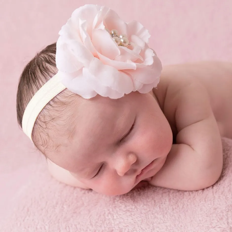Cute Cute girls pale pink silk flower headband with diamanté and pearl centre. It is attached to a soft, very stretchy ivory elastic band.
