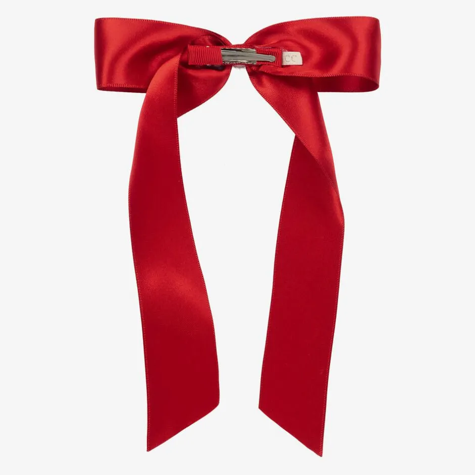 Gorgeous handmade red satin bow for girls by Cute Cute. This pretty hair accessory secures with a metal clip and has delicate diamanté trims.