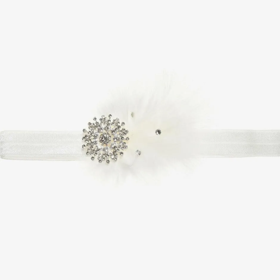 Cute Cute girls white marabou feather headband. This pretty design is decorated with a large rhinestone jewel and Swarovski diamantes. It is attached to a soft, very stretchy ivory elastic band.