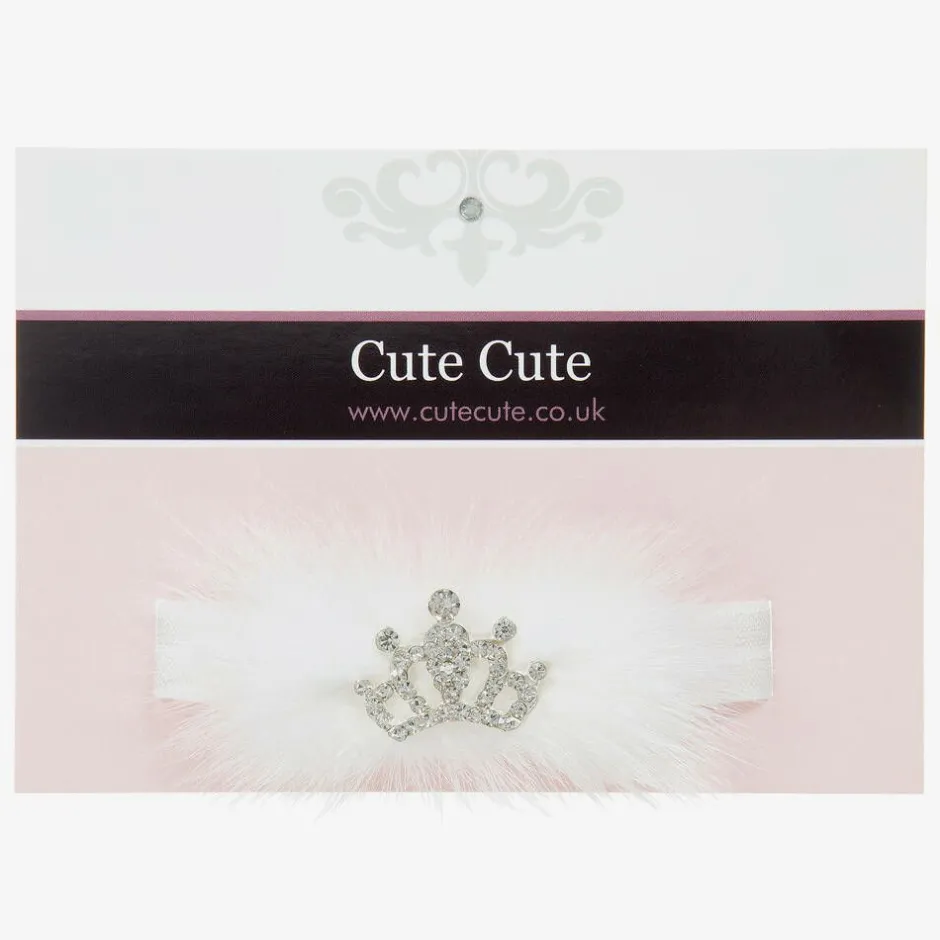 A lovingly handmade girls headband by Cute Cute, with white fur and a crown diamanté. It is soft and comfortable to wear and the band is elasticated.