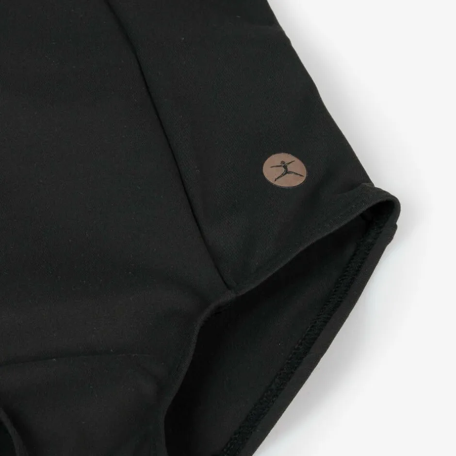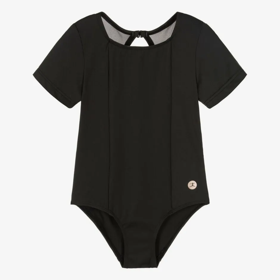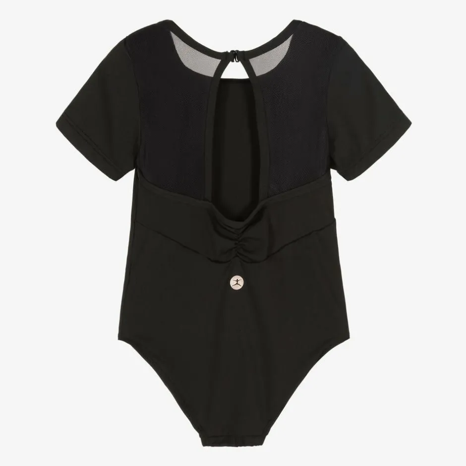 Black leotard for girls by dancewear designer, Danskin. Made using the designer's super soft four-way stretch fabric for free movement, this style is ideal for ballet and dance classes. It has a mesh panel on the back with an open panel and stylish ruching. It is comfortable, breathable and fastens with a clasp on the back of the neck. Rose gold logo prints add a touch of branded shine to the piece.