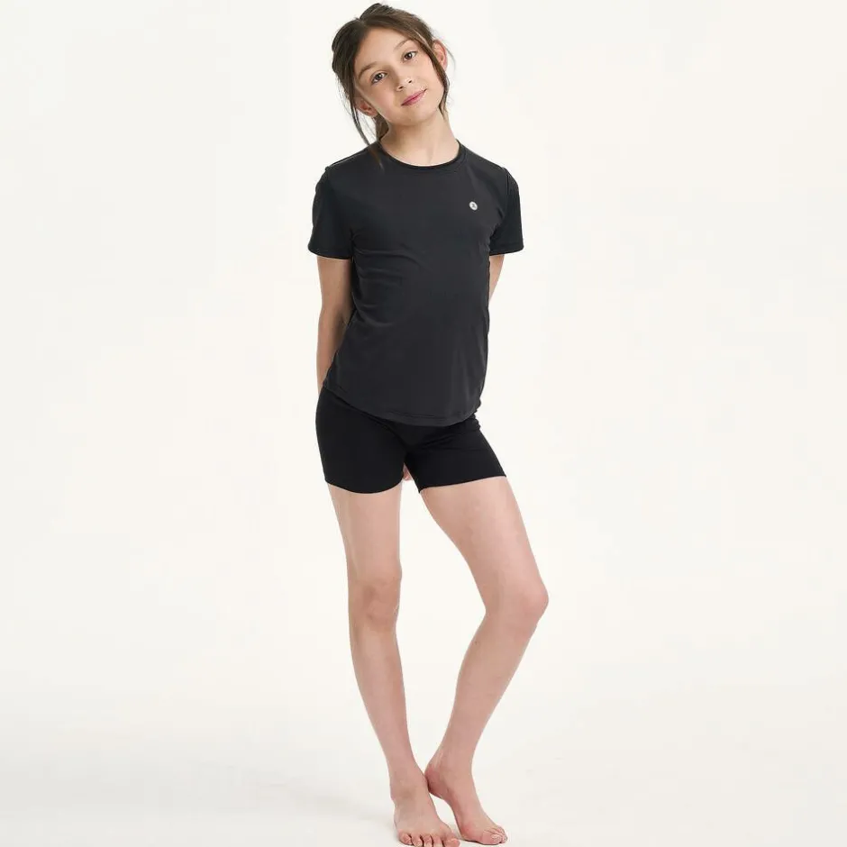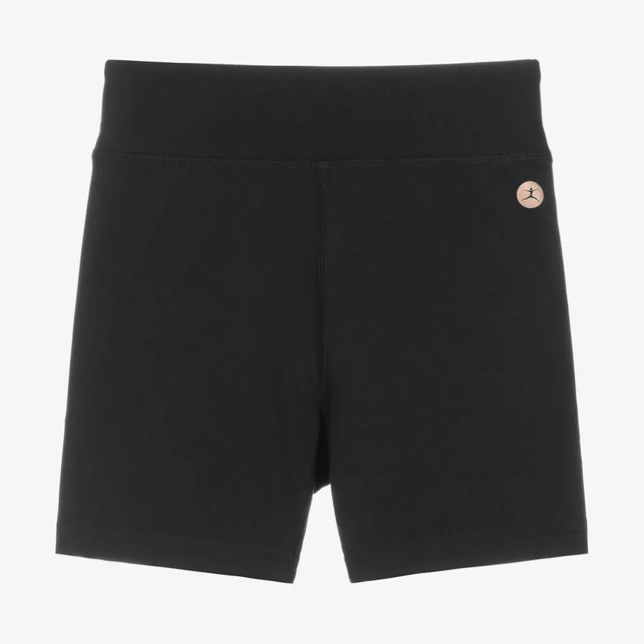Girls black sports shorts for girls by American designer, Danskin. Lovely for dancing and exercise, the super soft and stretchy fabric has four-way stretch and is great for free movement. They have a wide, elasticated waistband for comfort and a rose gold logo printed on one side.