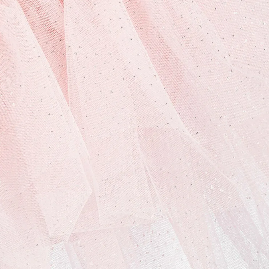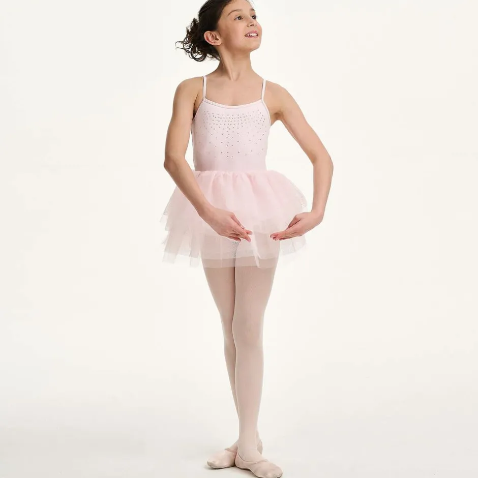 A delightful pale pink tutu dress for girls by dancewear brand, Danskin. Lovely for ballet and dance classes, the leotard is made from a super soft and stretchy fabric, allowing free and easy movement. It is designed with slim shoulder straps and has beautifully sparkly diamantés decorating the bodice. The gorgeous tutu skirt is made from tiered layers of glittery tulle for a pretty finish.
