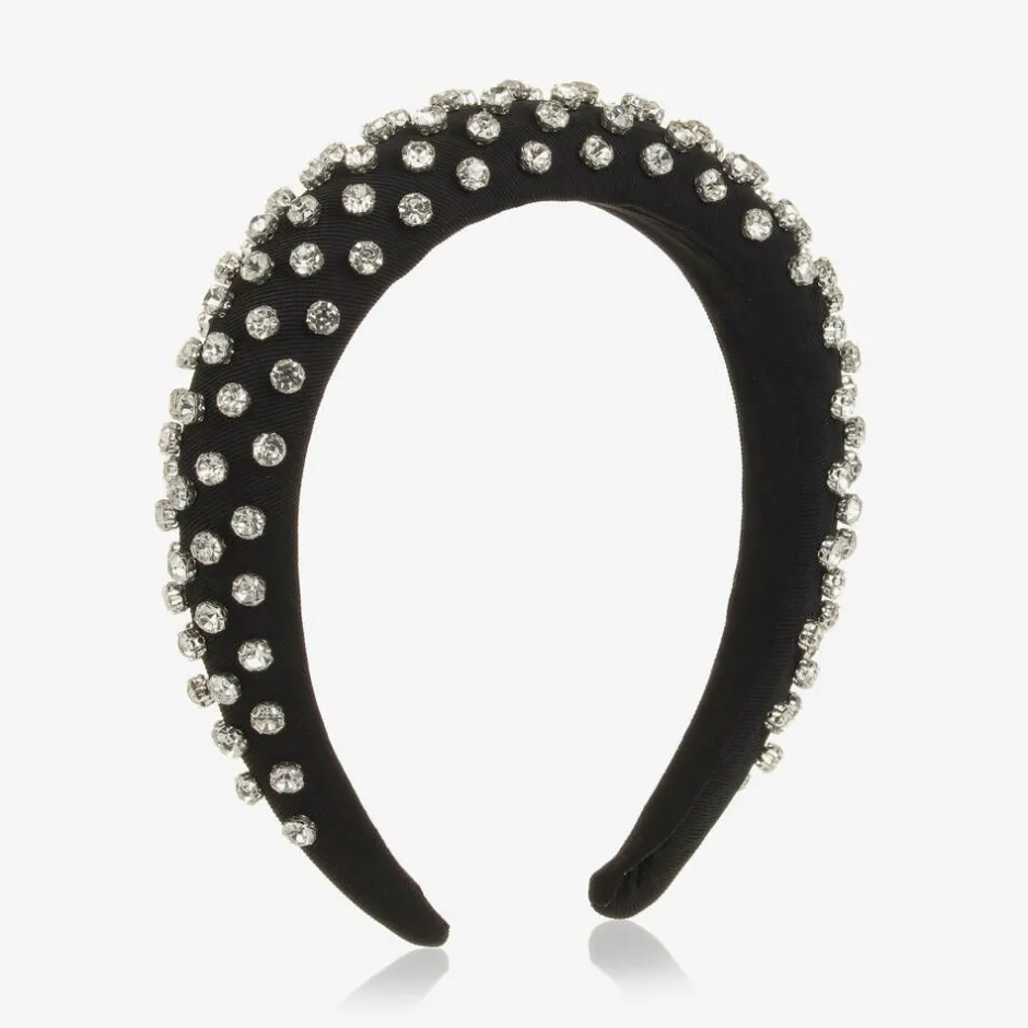 Stylish black hairband for girls from David Charles. The fabric-covered flexible band is padded and embellished with diamantés for a touch of sparkle.