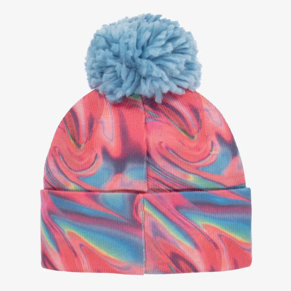 Warm and cosy, a pink and blue knitted hat for girls by Deux Par Deux, with a swirling, marbled pattern. It has a large pale blue pom-pom on top and a reflective silver logo badge sewn on the front. An ivory fleece lining gives extra protection against the cold.