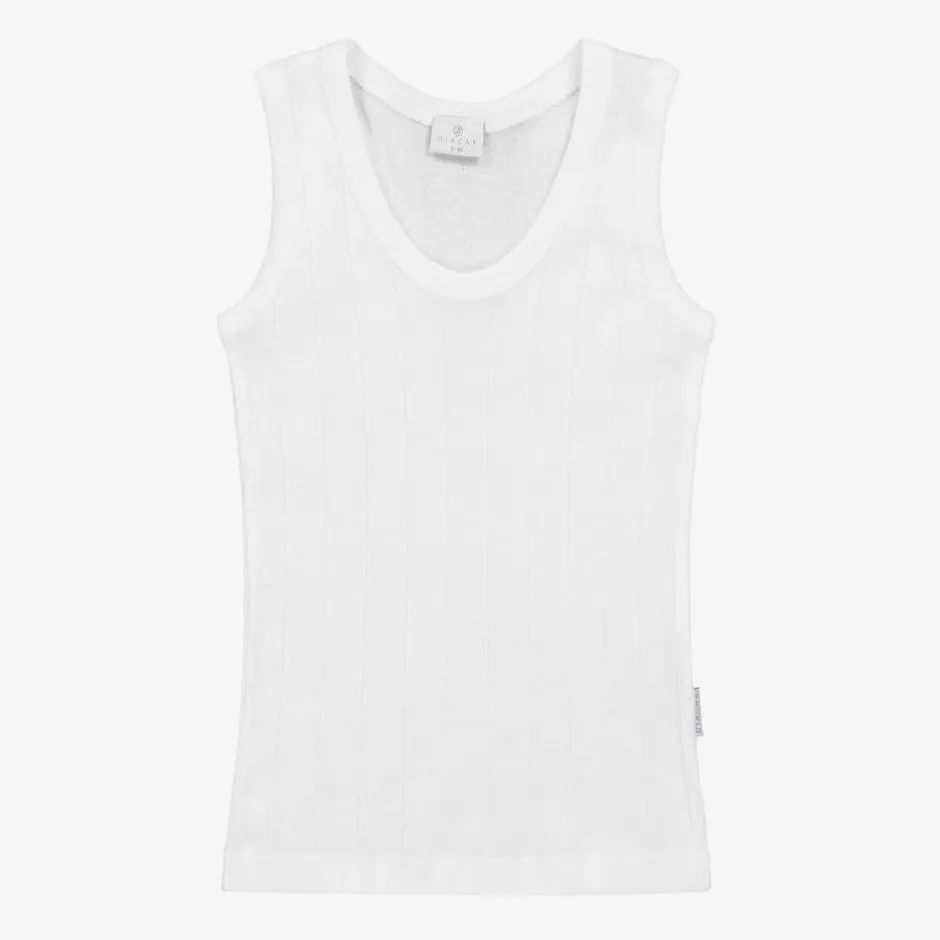 A white vest for boys by Diacar. Made from soft cotton jersey with a subtle pinstripe pattern, this simple top is comfortable to wear and easy to layer under clothes for additional warmth.