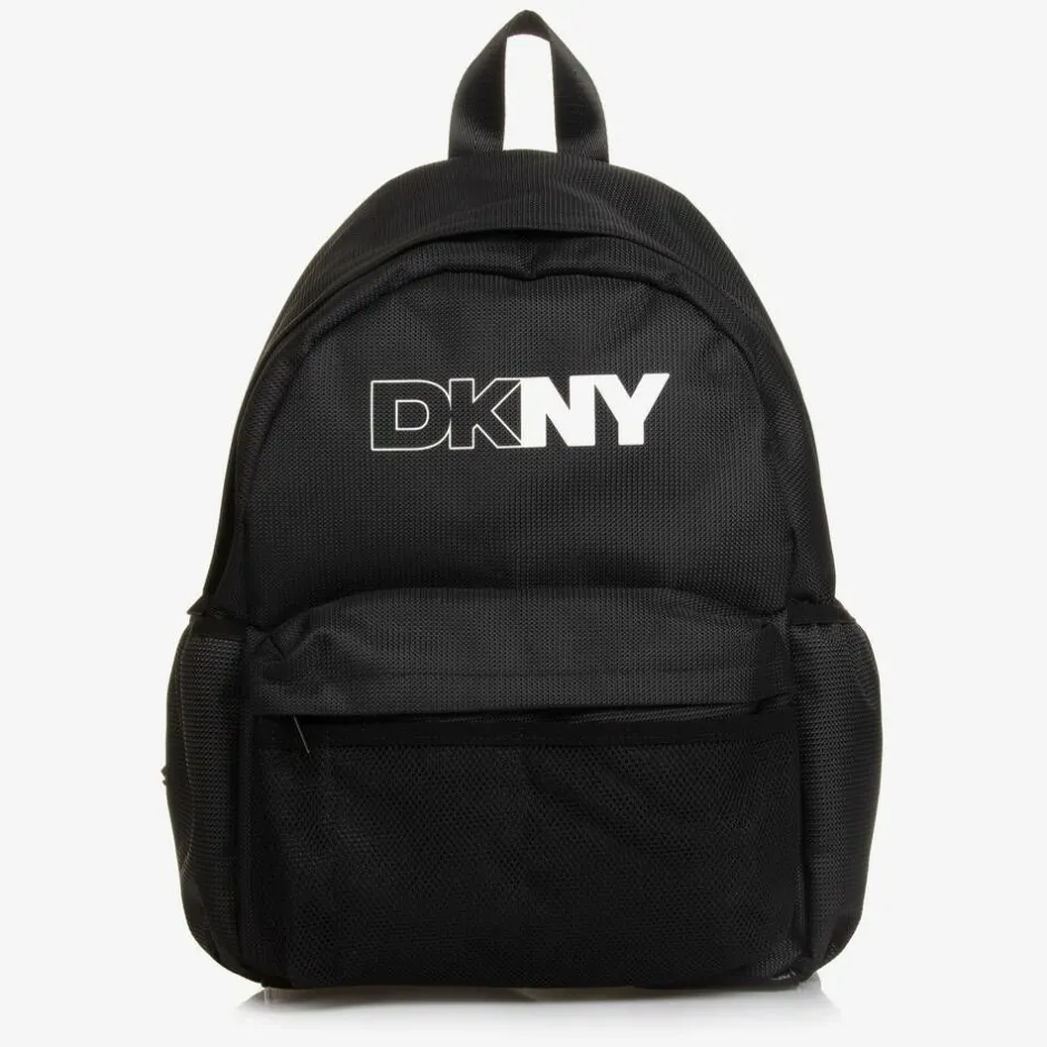 Black backpack for boys and girls by American label DKNY, made in textured canvas for durability. Super stylish and practical, this zip-up bag has bright white logo graphics and multiple inner and outer pockets, some made in mesh, for all their essentials. Lined with smooth fabric, it has a top carry handle and a padded, breathable mesh back, with subtle logo embossing for extra designer appeal. The shoulder straps are adjustable and padded for comfort.