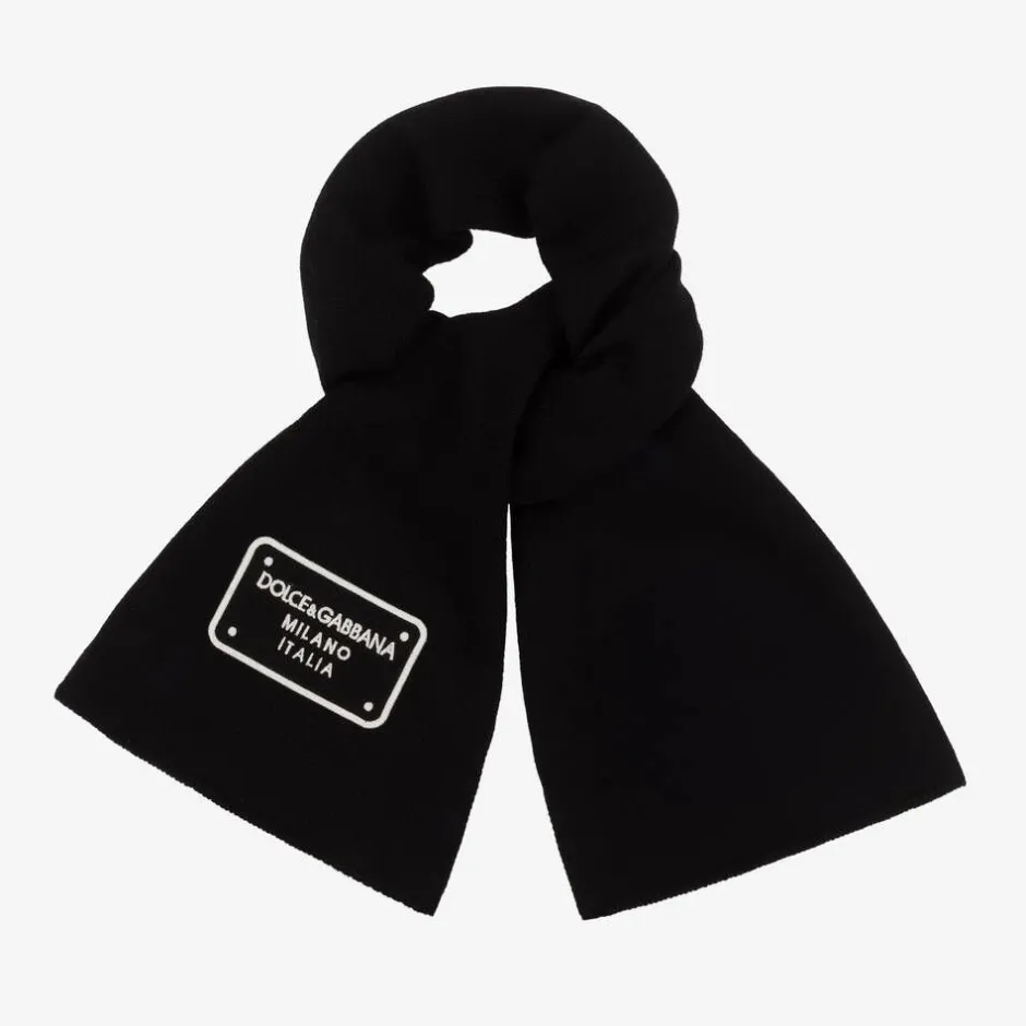 Black scarf for boys and girls by Dolce & Gabbana, the luxury Italian designer. This cool accessory is knitted in the finest virgin wool for a beautifully soft feel. Statement monochrome branding accents this cold-weather style.