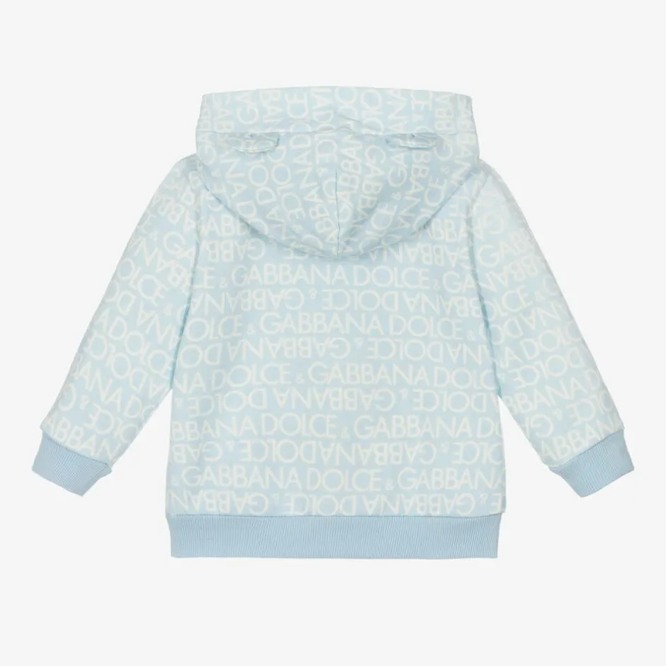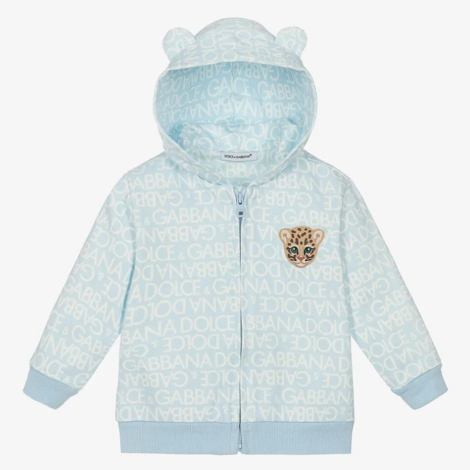 Younger boys pale blue and white zip-up top by luxury designer Dolce & Gabbana, made in soft jersey. Patterned with a bold logo design, this cute top has a sweet leopard motif appliquéd on the chest and gently ribbed trims for comfort. Long-sleeved, it fastens with a branded zip on the front and has a large jersey-lined hood, cosy for little ones.