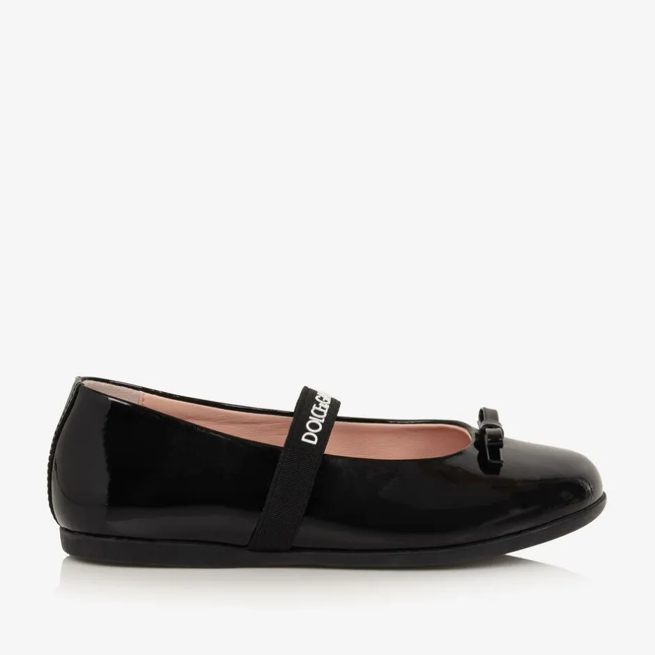 Stylish black ballerina pumps for girls by luxury Italian label Dolce & Gabbana, made in glossy patent leather. In an easy slip-on style, these chic pumps have an elasticated strap across the foot, with bold white branding for designer appeal. There is a dainty bow on the front adding a pretty finishing touch. They are lined in soft leather, with a lightly cushioned insole for ultimate comfort and a non-slip rubberised outer sole providing good grip.