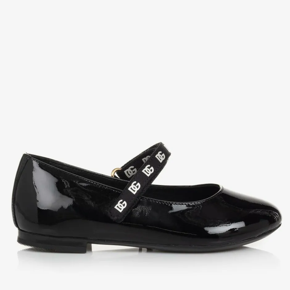 Black patent leather ballerina pumps for girls by luxury Italian brand Dolce & Gabbana. These chic pumps fasten with a velcro strap across the foot, which is trimmed with white DG logos for instant designer impact. They have a reinforced heel for sturdiness and a lightly padded insole for extra comfort. They are fully lined in soft leather and have a non-slip rubber outer sole for practical grip.