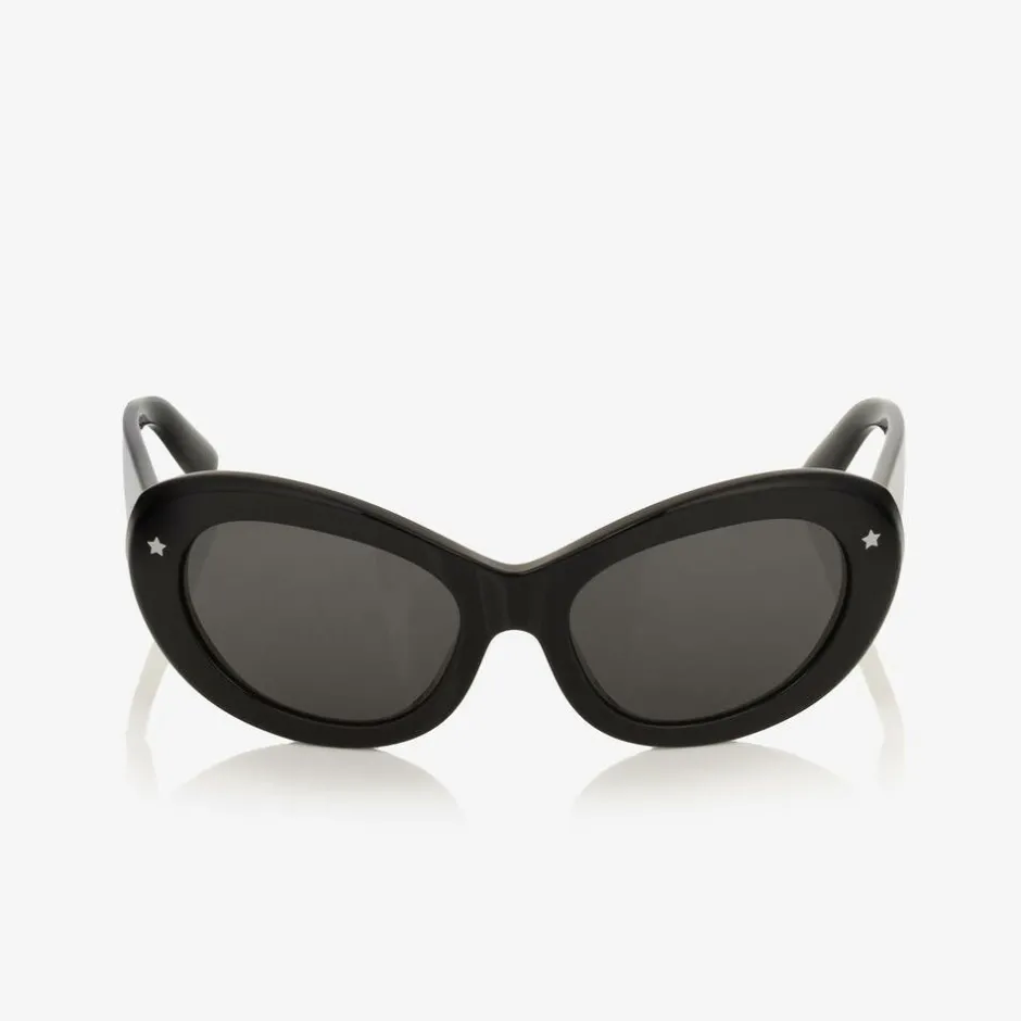 Stylish black sunglasses for girls by luxury Italian brand Dolce & Gabbana. The chunky, oval frame has a little white star design on each side and dark grey tinted lenses, made with optical precision to protect little one's eyes. Adding a luxury touch to these sleek accessories, the designer's white logo is stamped on the wide statement arms and they come with a branded silicone case for safe storage.