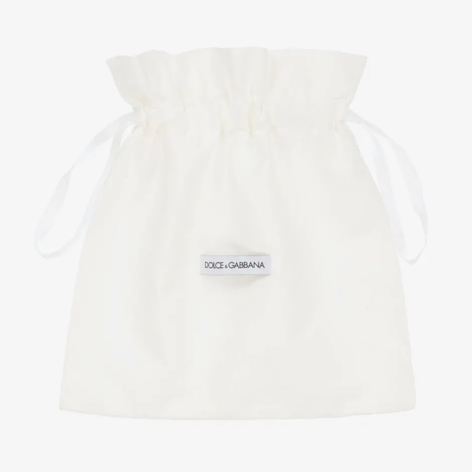 Glittery silver ballerina pumps for girls by luxury label Dolce & Gabbana. Lovely for those special occasions, these elegant pumps are trimmed on the front with a dainty bow and silver metal DG logo. Made and lined in fine leather, they have a lightly cushioned insole for lasting comfort and a rubberised, non-slip outer sole for improved grip.
