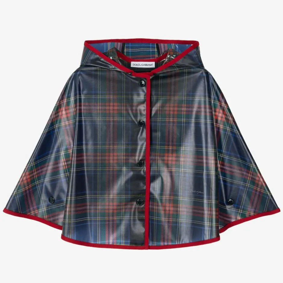 Stylish rain cape for girls by luxury Italian brand Dolce & Gabbana. Made in a smooth showerproof fabric, it has a navy blue, red and green tartan pattern and red trim This lightweight hooded cape has branded popper fastenings on the front and poppers on the sides to create armholes. It has a signed logo within the pattern on the front for a discreet designer finish.