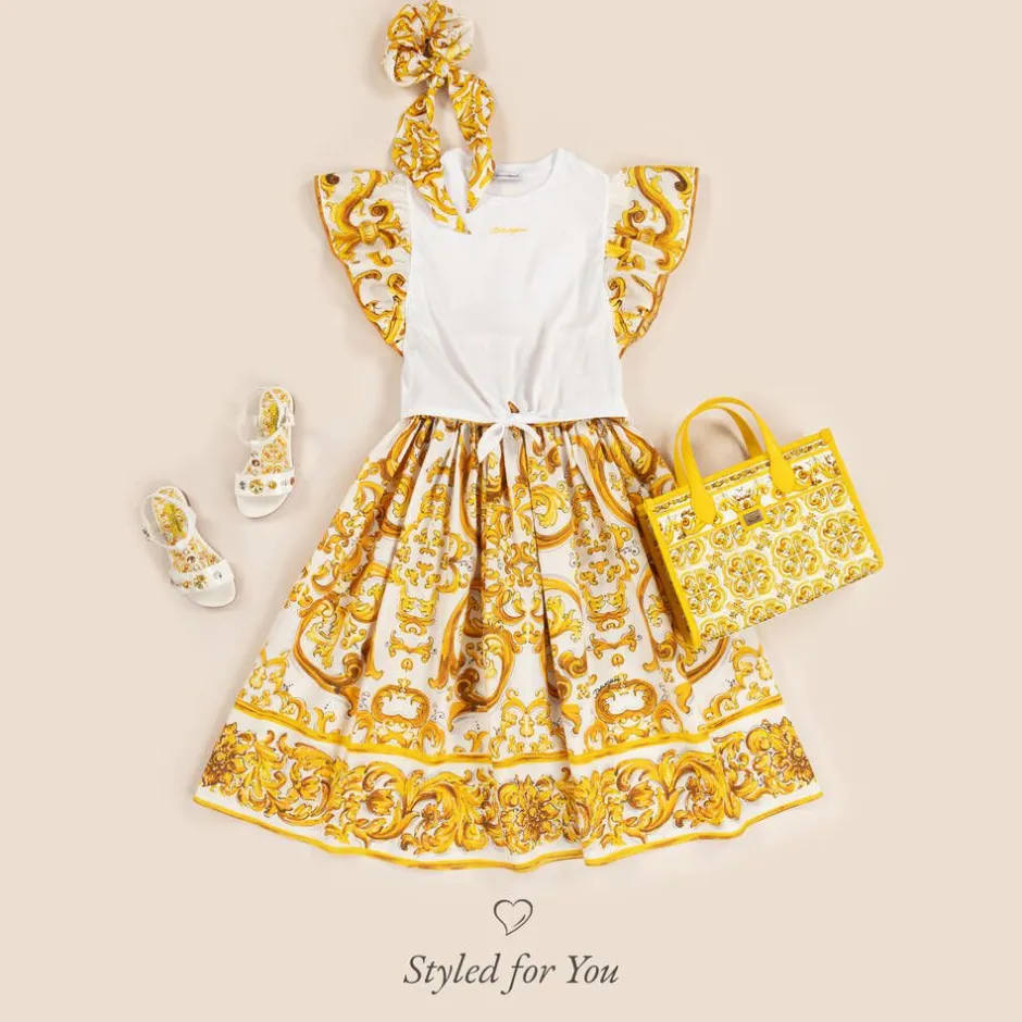 Gorgeous white sandals for girls by luxury Italian designer Dolce & Gabbana, crafted in patent leather with sparkly crystals in shades of yellow. To complement the glistening embellishment, the soft leather insole is patterned with the signature Majolica design, inspired by vibrant Sicilian tiles. They have an adjustable, buckle-fastening ankle strap and non-slip rubber soles.