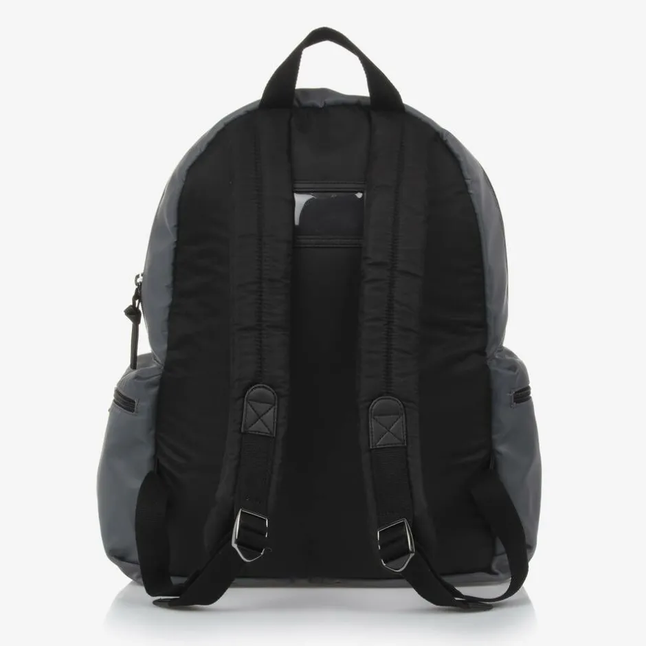 Grey backpack for boys and girls by luxury Italian brand Dolce & Gabbana. Made in smooth, shiny canvas, it has a large compartment with a zip fastening across the top. There are two side pockets also fastening with zips. The back and adjustable shoulder straps are padded for comfort and there is a useful carry handle. For a statement designer finish there is a large black and white rubberised logo across the front.