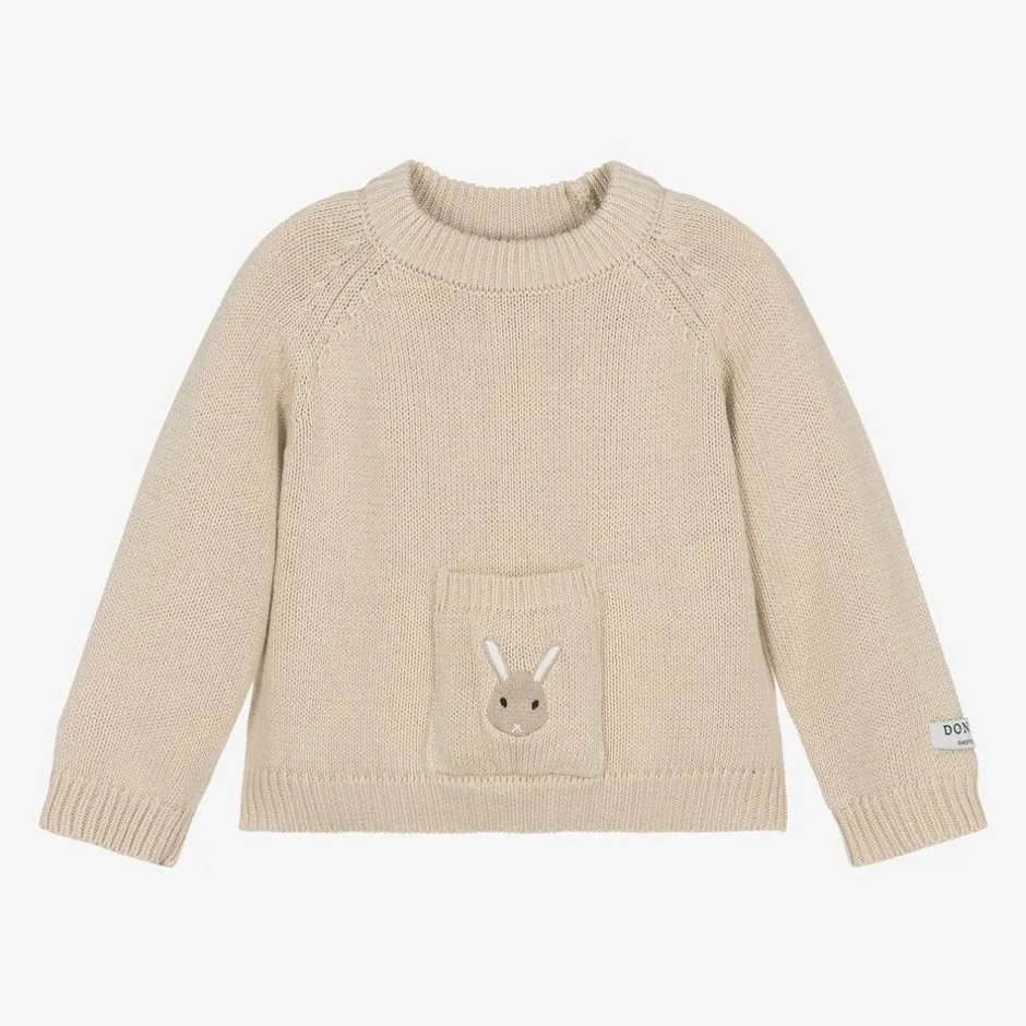 Amsterdam-based brand Donsje designs this beige handmade sweater for younger boys and girls. Soft and gentle on the skin, it is knitted in pure cotton. The front pocket feature is embroidered with an adorable bunny rabbit motif and the designer's logo label is stitched on the sleeve.