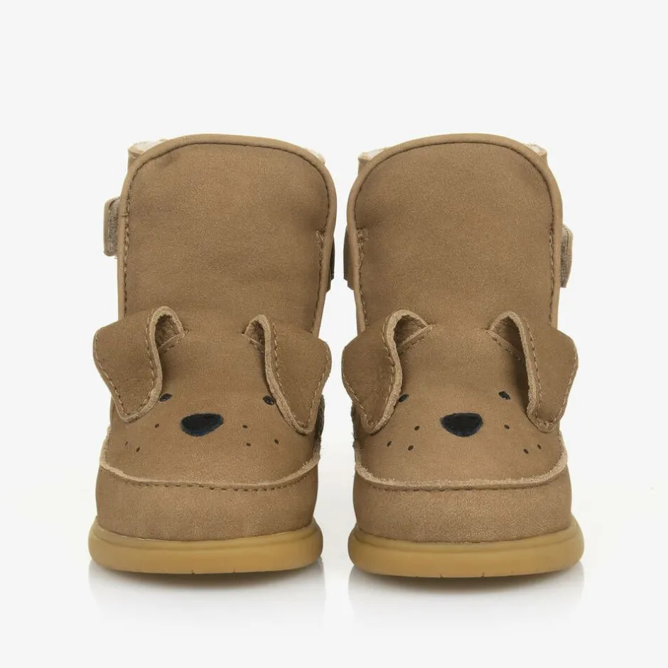 Both fun and practical, these brown leather boots for baby boys and girls are by Dutch brand Donsje. Lined in cosy, wool fleece, they have a cute dog's face on the front, with 3D ears and an appliqué nose. Easy to put on and take off, they have a velcro fastening around the heel and a sturdy, non-slip sole, just right for little feet. There is an embossed logo around the back for a subtle designer touch.