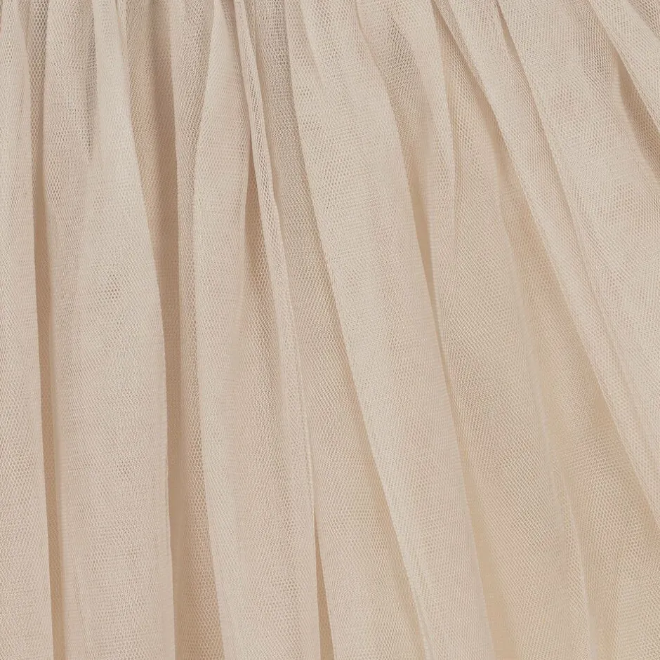 Lovely dusky pink dress for little girls by Dutch brand, Donsje. Knitted in a soft wool blend, the ribbed bodice has a cosy turtle neck and an embroidered logo tab on one sleeve. The fine tulle skirt is gently elasticated at the waist and lined in lightweight cotton for comfort. This easy-to-wear style simply slips over the head.