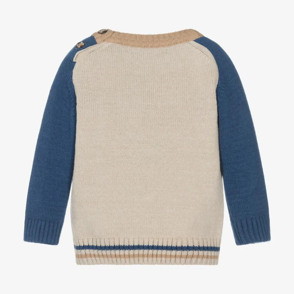 A cosy beige sweater for younger boys by Portuguese brand Dr. Kid, knitted in a soft cotton blend. Designed with long blue sleeves and a ribbed crew neckline, it has a cute intarsia knit tractor and bear design on the front in complementary shades of blue and beige. It is finished with a striped hem and to help with dressing, smaller sizes have button fastenings on one shoulder.