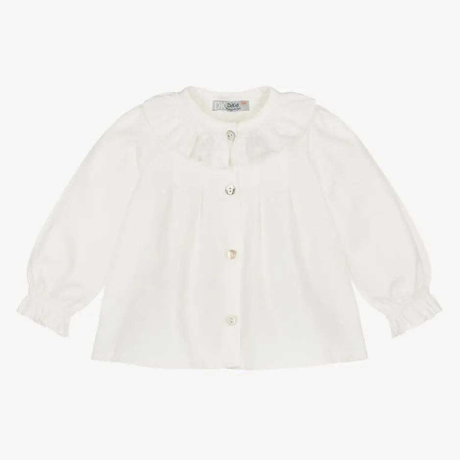 A traditionally styled, ivory long-sleeved blouse for little girls by Dr. Kid. Made from a smooth cotton-blended twill, it has tonal shirred detailing and dainty picot trims on the ruffled collar and stretchy frilled cuffs. It is sweetly pleated on both sides and fastens with mother-of-pearl buttons on the front.
