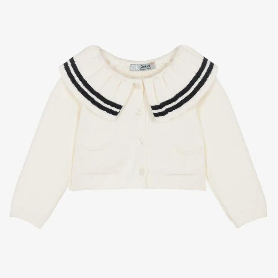 Lovely ivory cardigan for girls by Dr. Kid, knitted in a soft blend of cotton and wool. The ruffle collar has navy blue stripes for a nautical-inspired look. It fastens easily with buttons on the front and has sweet front pockets for style.