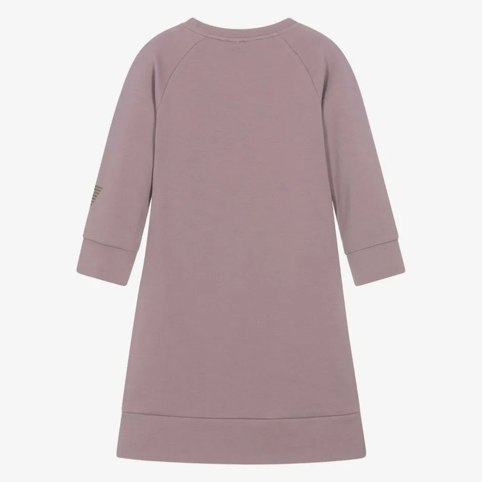 Mauve purple long-sleeved sweatshirt dress for girls by EA7 Emporio Armani, made in soft, mid-weight cotton jersey with a fleecy inside. Simply styled with lightly ribbed trims, it has a split hem for ease of movement and a useful pouch pocket. For designer appeal, the brand's signature EA7 logo can be seen on the front in shiny rose gold, with 'Girl 7' on one sleeve adding a stylish finish.