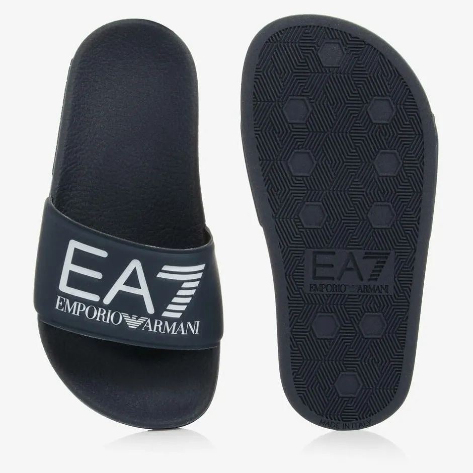Navy blue sliders for boys and girls from EA7 Emporio Armani, cool for the pool, on the beach or to compliment everyday casual outfits. These easy slip-ons are made from soft rubber with a moulded footbed for comfort. They have a bold white logo embossed across the strap for instant recognition and an additional branding moulded on the sole.
