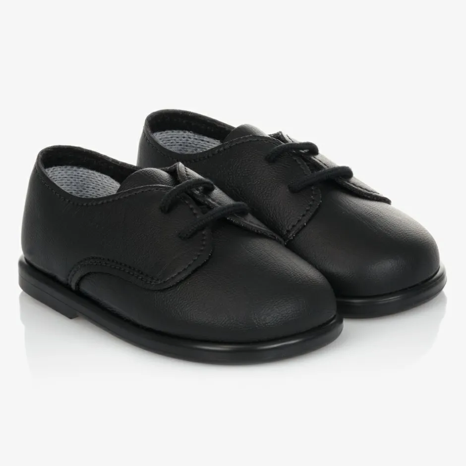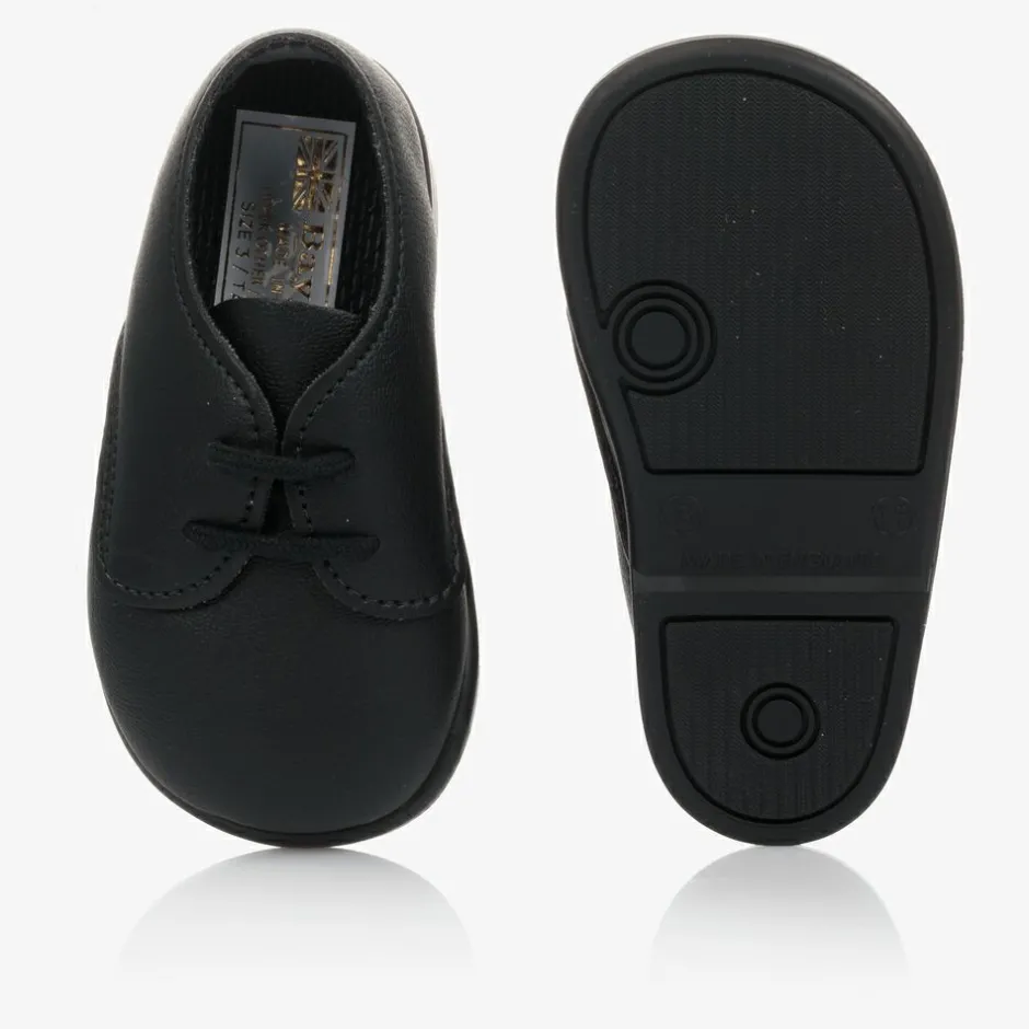 Little boys black first walker shoes by Early Days, with laces to fasten. From the designer's Baypods collection, they are made from soft faux leather, with a fabric lining and inner sole. Traditional in style, they have ankle support and flexible rubber outer soles.