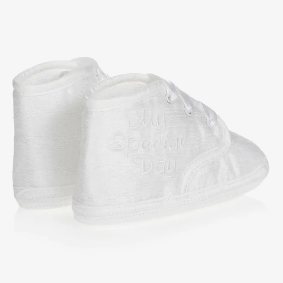 Gorgeous little white silk dupion booties by Early Days, with satin laces and "My Special Day" embroidery on the sides. Suitable for baby boys and girls, they have a soft and absorbent insole and lining.