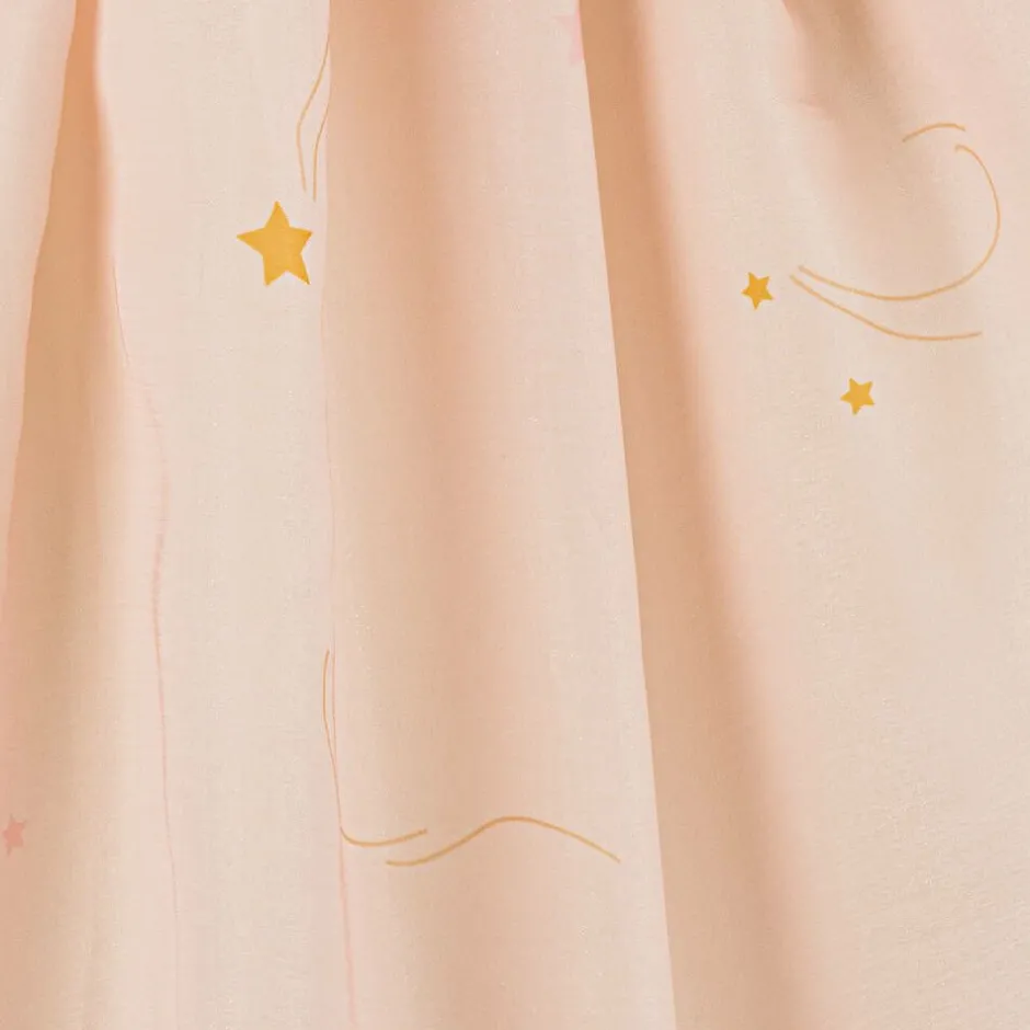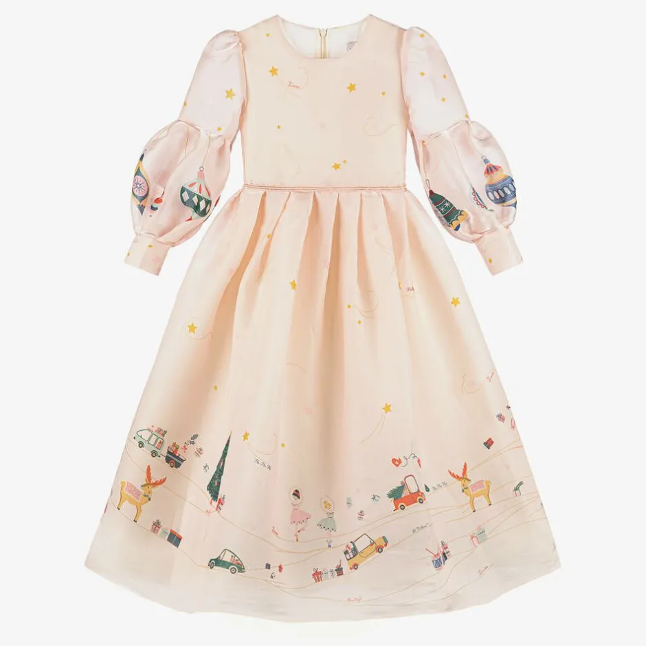 Girls pale pink dress by EIRENE, made in silky organza with a shimmer effect that beautifully catches the light. This lovely long dress has a magical festive print that incorporates yellow shooting stars, Christmas trees and cars full of colourful gifts. It has a lightweight feel, long puffed sleeves and a gently pleated waistline for a fuller silhouette. The dress is lined with soft cotton fabric and fastens neatly on the back with a concealed zip.