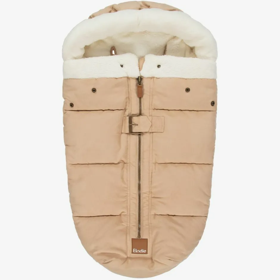 Beige footmuff for baby boys and girls by Swedish brand Elodie, with ivory faux fur trim. Made in a soft suede-feel fabric, it is thickly padded for warmth and lined in plush ivory faux fur. It has a chunky central zip fastening, with poppers at the top for opening up and fixing down. There are pre-cut holes at the back for attaching to a car seat or stroller.
