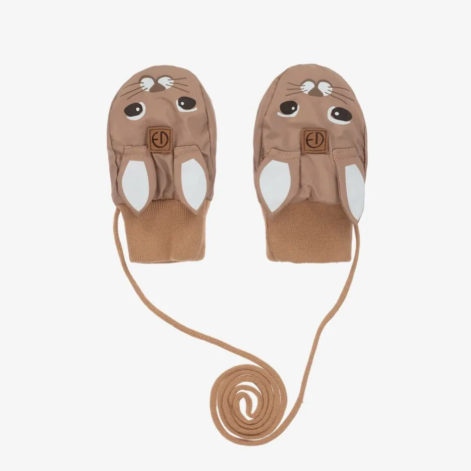 Adorable brown thumbless mittens for baby boys and girls by Elodie, with a sweet bunny face and 3D ears. Made from smooth recycled fabric with a wind-resistant and water-repellent coating, they are lined in soft polar fleece with ribbed cuffs for cosy warmth. They are secured with a knitted string to prevent them from being lost.