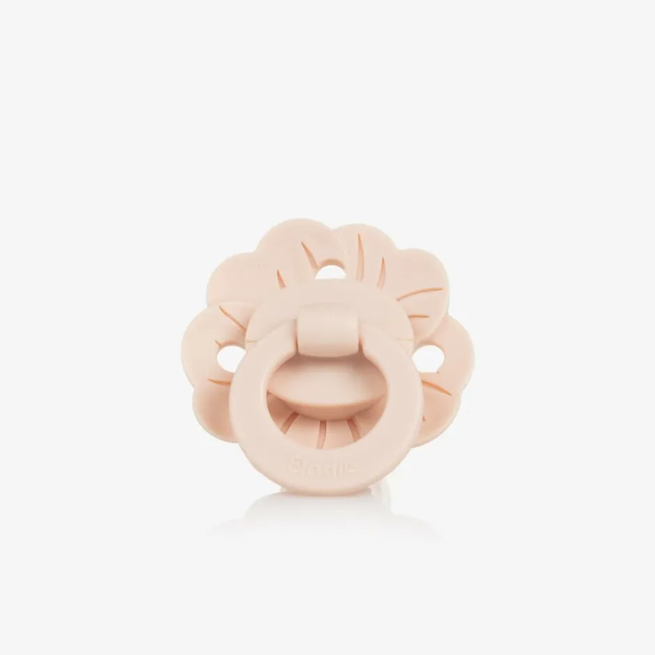 A pretty, powder pink floral dummy for baby girls by Elodie, a unique shape for the Swedish brand. It features a symmetrical silicone teat and the flower-shaped shield has three ventilation holes to allow air circulation and prevent skin irritation. It is completely free from harmful substances such as BPA, phthalates, and PVC.